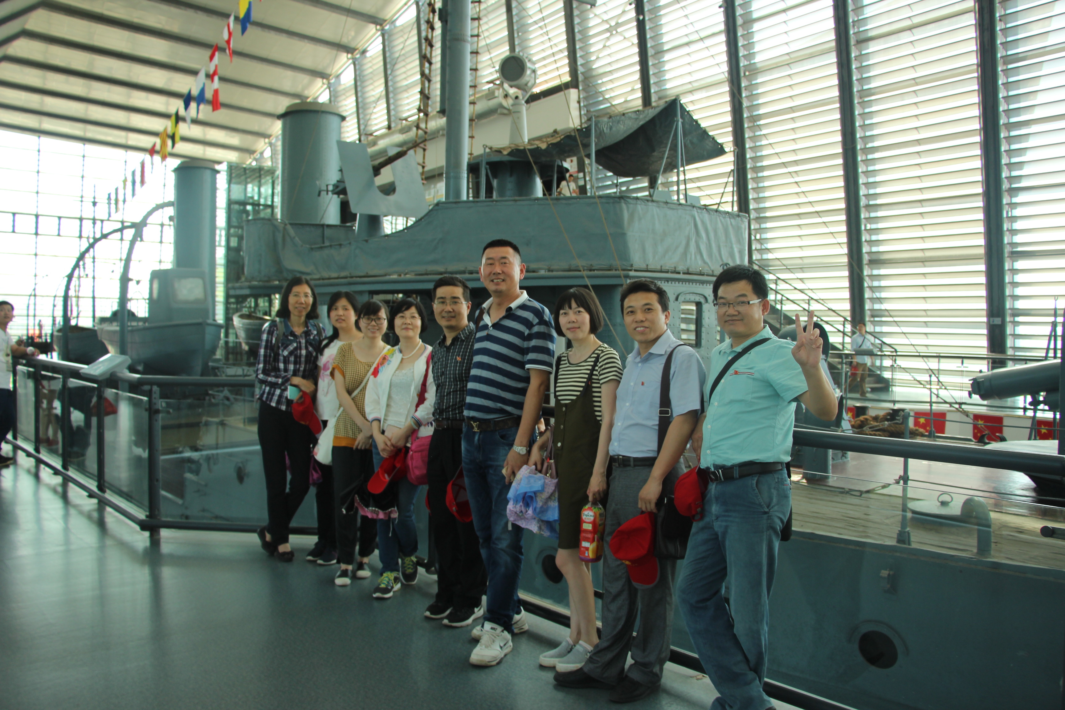 继而大家一行来到了中山舰博物馆,中山舰原名永丰舰,隶属于北洋政府海军第一舰队,为纪念一代伟人孙中山先生,此舰后改名中山舰。1938年在“武汉保卫战”中,中山舰与日军展开激烈战斗,最后在敌机的轮番轰炸下沉入金口水域,舰上25名官兵壮烈殉国。中山舰曾参加过“护国运动”、“孙中山广州蒙难事件”、“中山舰事件”和“武汉保卫战”等重大历史事件,是我国近现代海军发展史上重要的历史见证物。面对按照历史原貌修复的战舰和舰体右前甲板上留下直径约一米的弹洞,无比震慑,驻足于舰体陈列厅中打捞上来的舰载设施、武器装备、生活用品、铭牌标志等珍贵实物及打捞过程的图片资料,感慨万千。警醒着我们永远不能忘记那段屈辱的历史,永远牢记落后就要挨打的教训。