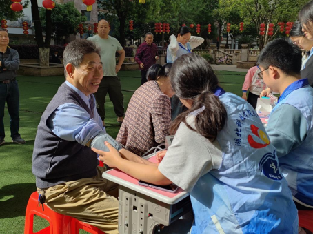 活动伊始,志愿者们分为多组展开行动。在社区广场上,药学专业学生手持便携式血压仪,为老年人提供免费血压测量服务。面对老人们的健康咨询,志愿者们从专业角度耐心解答,围绕“血压管理”“药物依从性”“饮食运动建议”等话题进行科普,并发放《用药安全手册》宣传单,帮助老年群体树立科学健康观念。一位年过七旬的张奶奶感慨:“这些孩子讲得清楚又贴心,以后吃药可得仔细看说明书!”