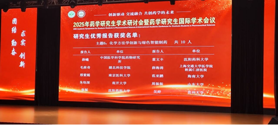 (通讯员:熊俊, 审稿:陈清杰)由中国学位与研究生教育学会医药科工作委员会主办,沈阳药科大学承办的2025年药学研究生学术研讨会暨药学研究生国际学术会议于2025年7月4-6日在沈阳隆重举行。我校研究生毛浓奇在指导教师熊俊的悉心指导下,凭借出色的表现,在此次高规格的学术会议中脱颖而出,荣获研究生优秀报告奖,这也是我校首次在该类会议中获此殊荣。
