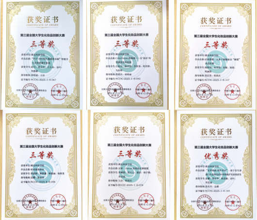 在这场高手云集的赛场上,经过激烈角逐,beat365正版唯一官网必一最终斩获6项国家级奖项,取得历史性突破。由胡明丽老师指导的赵可同学负责的项目《“POP AROMA爆珠香水贴”智能交互式情绪调节系统》、王诗老师指导的李佩瑶同学负责的项目《灵眸·Janus 双相仙灵脾眼膜》、程琪庆老师指导的左秋月同学负责的项目《ColorSense科颜感——智能变色痘痘贴》、莫启贵老师指导的杨欣怡同学负责的项目《活参静膜·人参干细胞驱动“睡膜”动态驻颜》、以及边樱等老师指导的章意婷同学负责的项目《柏术遗韵香水》荣获全国三等奖。由张丹丹老师指导的袁馨同学负责的项目《基于仿生渗透与生态珠光的中药智能护发系统研发》项目荣获全国优秀奖。获奖项目涵盖了产品创意与配方创意两大主流赛道,体现了学生多元的创新视角与扎实的专业功底。