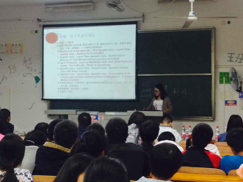 之后,12级张毅峰和马俊峰两位学长学姐向大家介绍了他们在西班牙为期五天的学习生活。大家简单地学习了西班牙的日常用语,气氛轻松愉快,充分调动了大家对语言学习的积极性。此时学长学姐向大家强调了语言学习的重要性,结合自身告诉大家学习外语时大胆开口的必要性,同时与大家分享了自己在大学的学习心得。