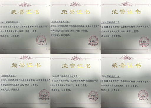 为更好地进一步引导学生恪守学术道德、弘扬优良学风、践行科学家精神,我院还组织各班级学生积极参与“弘扬科学家精神,共促优良学风”知识竞答,且对参与率在前6名的班级颁发了班级荣誉奖状,分别为2023级药物制剂班、2024级药学1班、2024级药学3班、2022级药学班、2023级化妆品科学与技术班、2024级药学2班,以上班级参与率均到达90%以上。