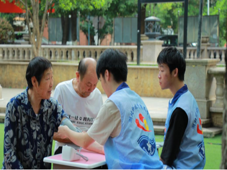 活动现场,志愿者们分工明确,有序开展各项服务。在健康监测区,药学专业的志愿者手持便携式血压仪,为老年人提供免费血压测量服务。测量过程中,志愿者们耐心细致,不仅准确记录血压数据,还从专业角度为老人解答健康咨询,并围绕“血压管理”“药物依从性”“饮食运动建议”等话题进行科普讲解,发放《用药安全手册》宣传单,帮助老年群体树立科学健康观念。一位接受服务的老人称赞道:“孩子们讲得专业又贴心,以后用药可得更谨慎!”